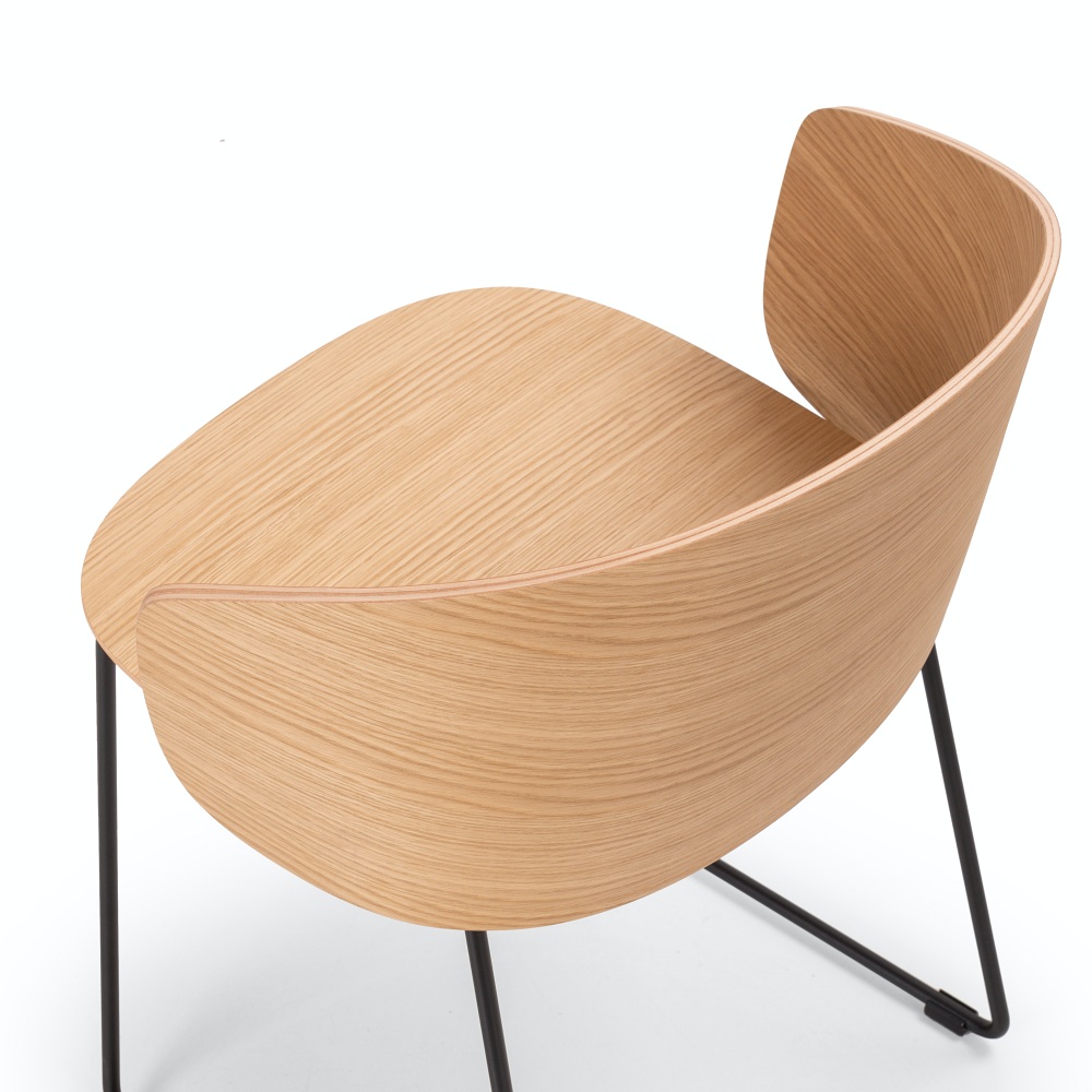 Available in many finishes: from oak to walnut, from ash to wenge, and in different versions: with tubular metal legs, sled base in steel rod or with solid wood legs. It is stackable, can be upholstered in the front, and can be placed in hospitality, catering, and community environments.