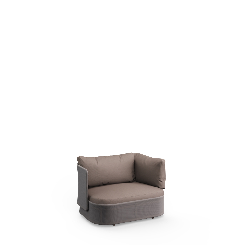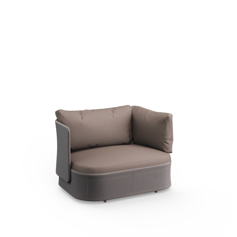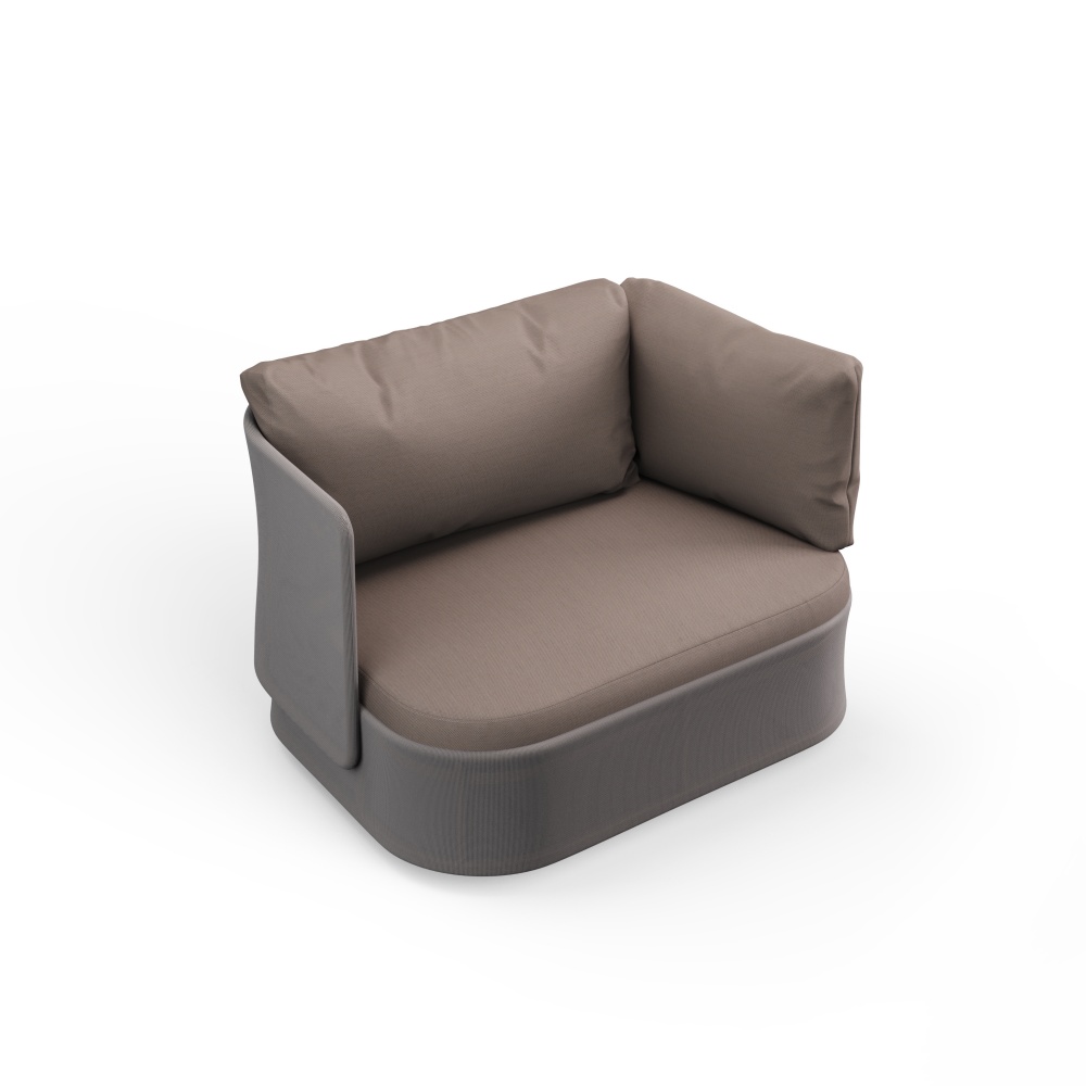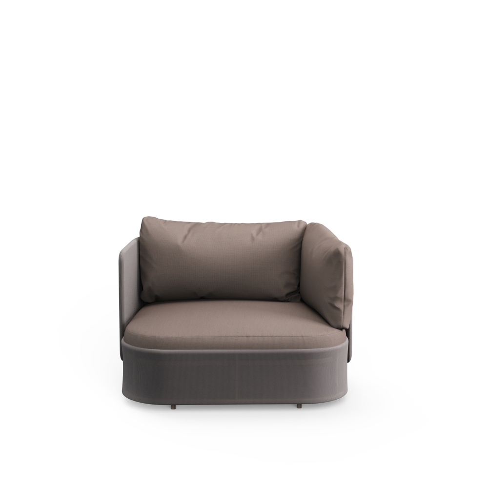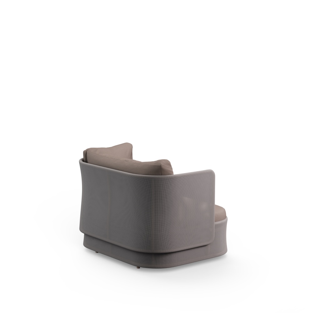 The PLAT family brings indoor comfort to the outdoors with the simplest design possible and offers the impeccable togetherness of aesthetics and functionality with its offbeat form. Considered as the substitute piece of the family in line with the plan of flexible use together with the single armchair and three-seat sofa models with large seatings, the pouf is designed in a way that it can also be used as a side table. Lightweight and easy to move thanks to its aluminum inner frame structure behind its monumental look, the PLAT family facilitates a stylish world. Combining simplicity and comfort in a refined aesthetic style, PLAT provides comfortable seating by rendering the vertical back rotations framing the asymmetric form suitable to ergonomics with the cylindrical-formed secret inner and outer cushions. PLAT is available in every color in the chart among the fabric options suitable for outdoor use and renders creative ideas applicable with the same or different color matchings on its inner or outer surface.